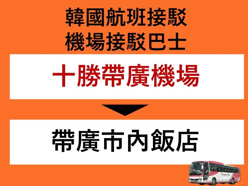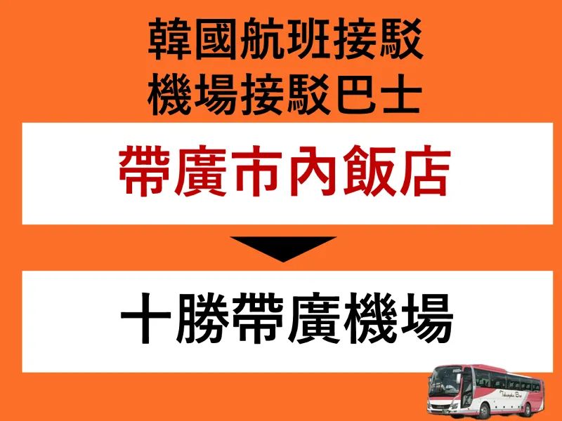 韓國航班機場接駁巴士【乘車】帶廣市內各飯店⇒【下車】十勝帶廣機場
